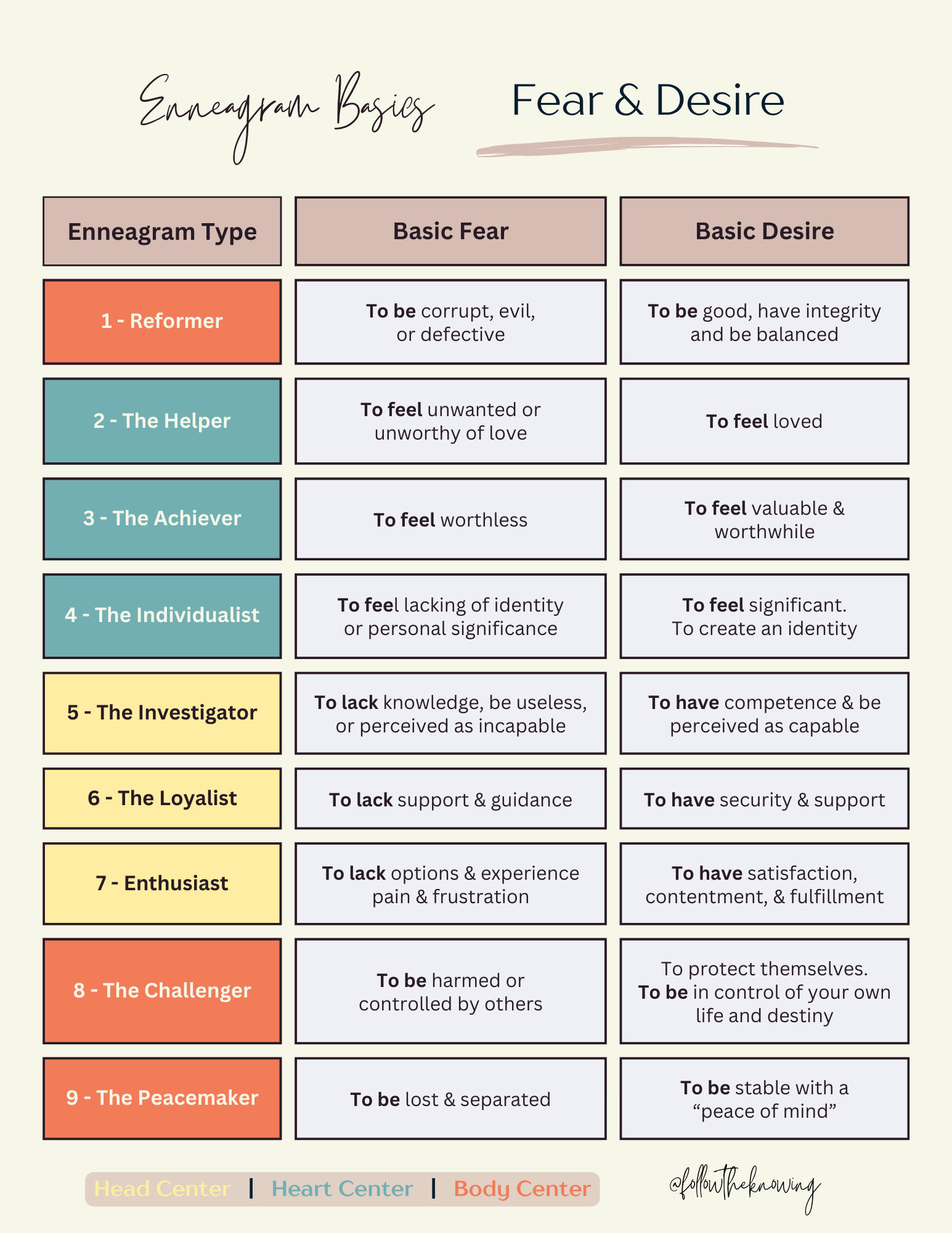 One tool that can help us better understand fears is the Enneagram. It’s an ancient personality typing system that offers wisdom around nine ways people relate to themself, others, and the world at large. Unlike most personality tests that focus on skills and behavior, the Enneagram focuses on motivation. It asks us to look at our basic fears and desires to unlock the patterns or pathways of how we show up in the world.